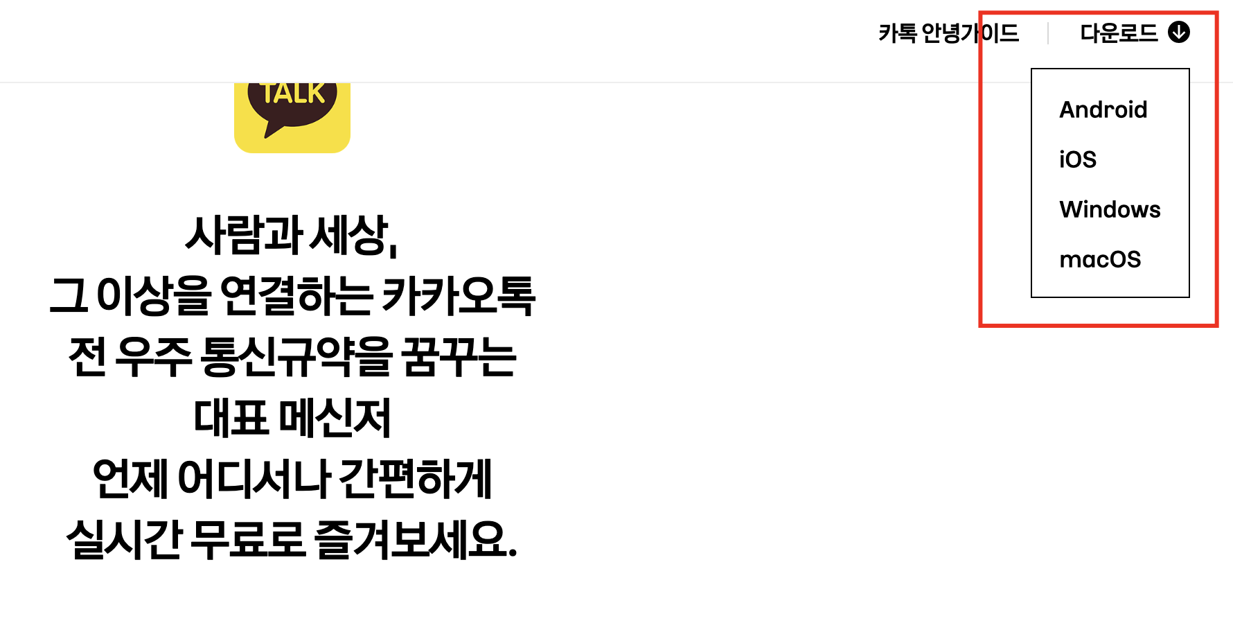 - 카카오톡 다운로드 공식 사이트 https://www.kakaocorp.com/page/service/service/KakaoTalk